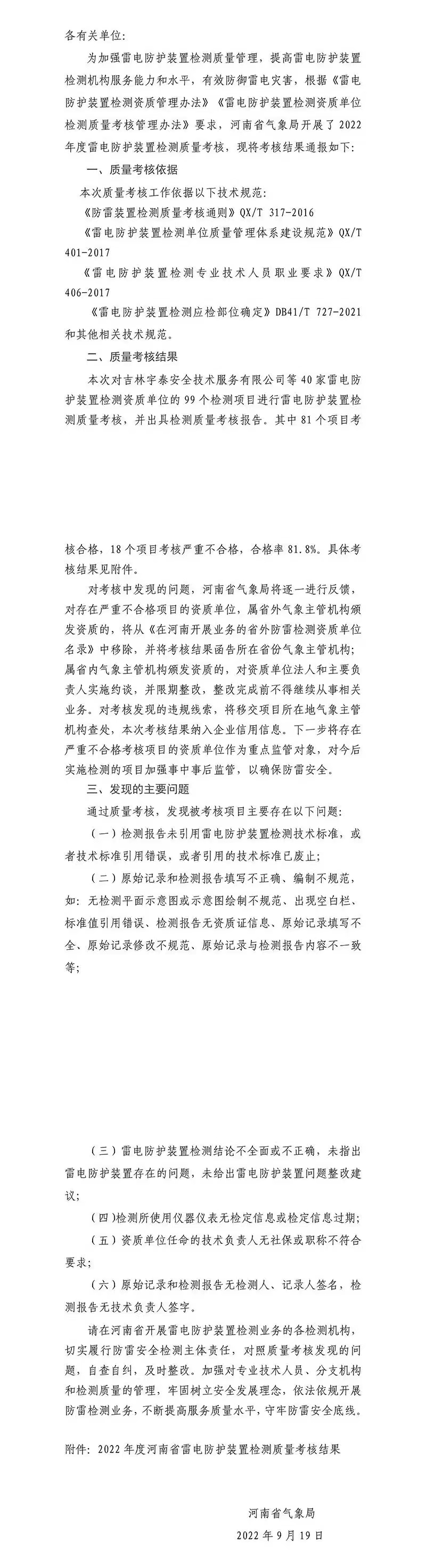 18個項目考核嚴重不合格|河南省:通報2022年度雷電防護裝置檢測質量考核結果