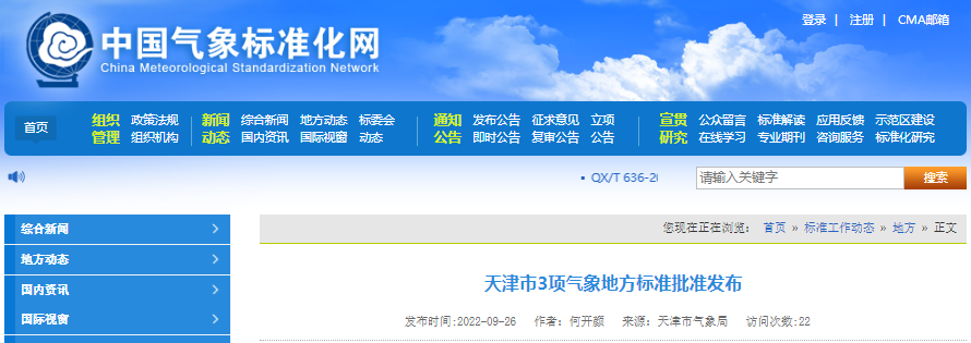 2022年9月8日,天津市市場監督管理委員會發布《天津市地方標準發布通告(第155號)》,《種植塑料大棚設計與安裝技術規范》(DB12/T 1141-2022)、《地面氣溫和相對濕度觀測數據均一化處理技術規程》(DB12/T 1151-2022)、《油氣化工碼頭及儲運設施雷電防護裝置檢測技術規范》(DB12/T 1152-2022)3項氣象地方標準正式發布,2022年10月14日正式實施。