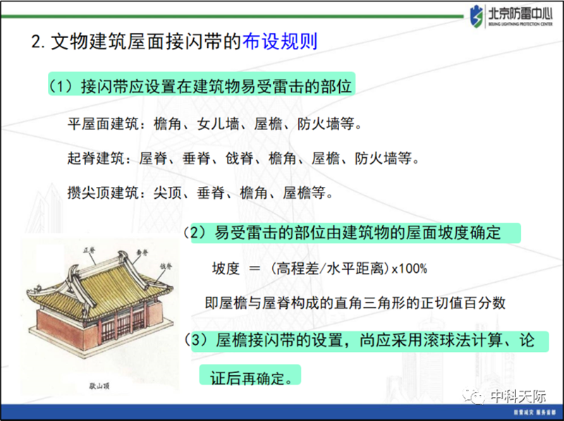 北京市避雷裝置安全檢測中心高級工程師宋平健從“文物建筑”“接閃帶的設置規則”“特殊情形的處理”,三方面作了《文物建筑接閃帶的設置》專題分享。他提出,對于坡度大于10%且小于50%以及對于坡度不小于50%的屋面易受雷擊的部位,尚應采用滾球法確定屋檐處接閃帶的設置。