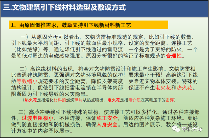 北京市氣象探測中心高級工程師陳泉從“現行文物防雷標準有關引下線的規定”、“引下線對文物建筑防雷的影響分析”、“文物建筑引下線材料選型及敷設方式”三方面,詮釋了他對《引下線及新材料的理解》。他提出,引下線的特殊連接結構可采用模塊化設計;在摸索和探索中才能促進技術和社會進步。