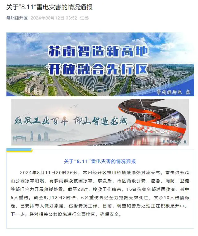 “常州經開區”微信公號8月12日發布通報:8月11日20時36分,江蘇常州經開區橫山橋鎮遭遇強對流天氣,雷擊致芳茂山公園涼亭坍塌,有躲雨群眾被困涼亭。事發后,市區兩級公安、應急、消防、衛健等部門全力開展救援處置。截至23時,搜救工作結束,16名傷者全部送醫救治,其中6人重傷。截至8月12日2時許,6名重傷者經全力搶救無效死亡,其余10人傷情穩定,已安排專人做好家屬、傷者安撫工作。目前,調查和善后處理正在積極展開中。下一步,將對相關公共設施進行全面排查,確保安全。